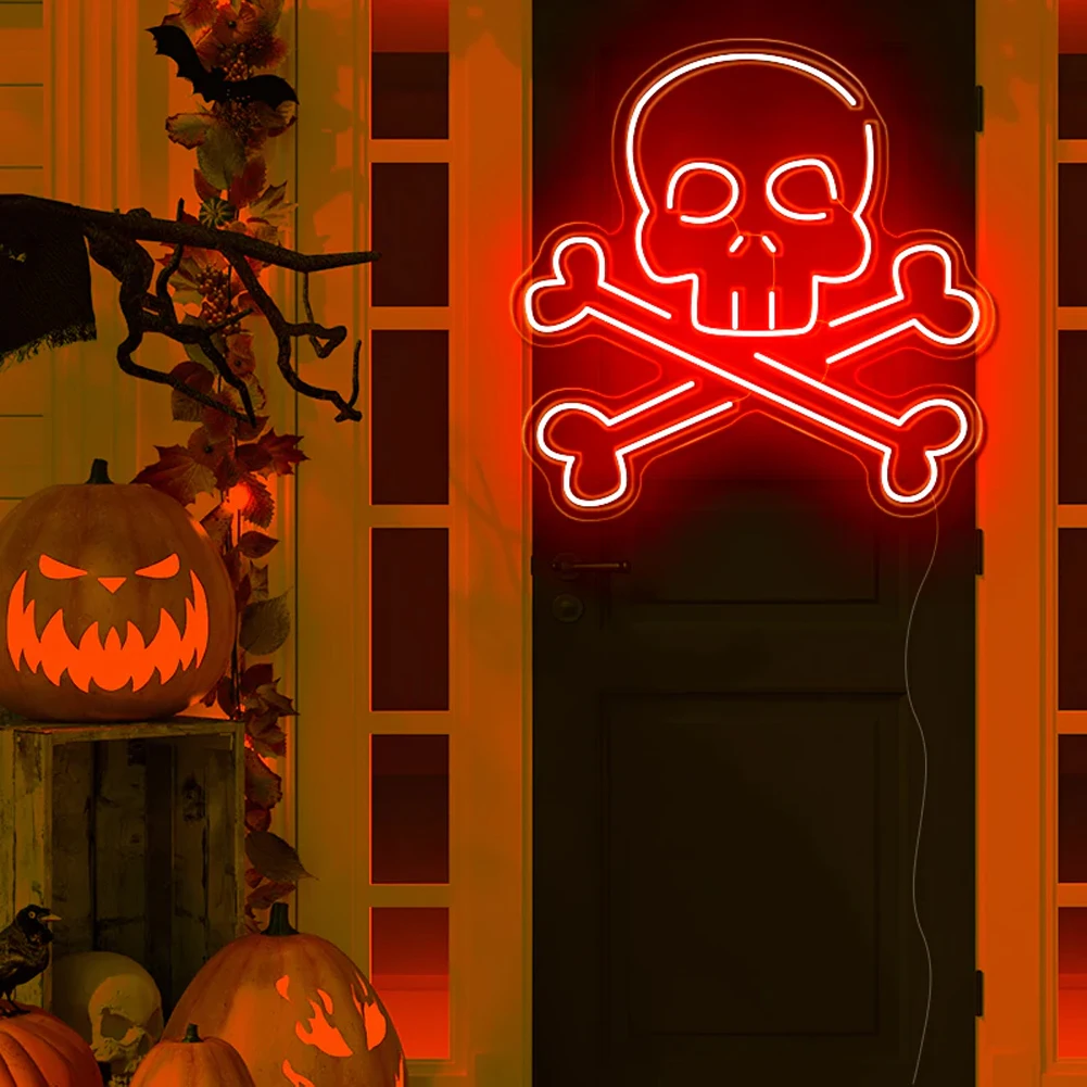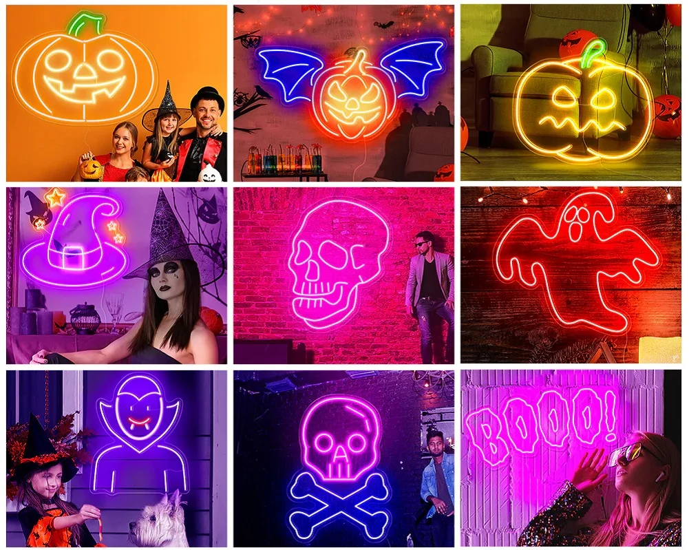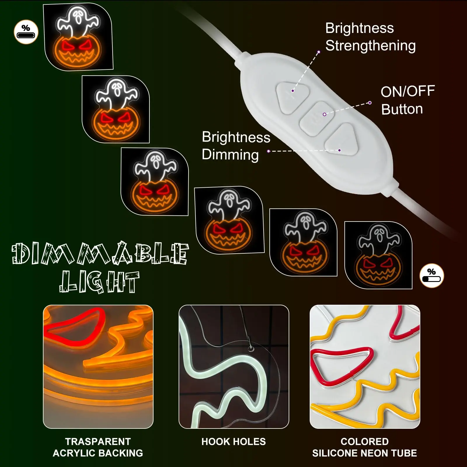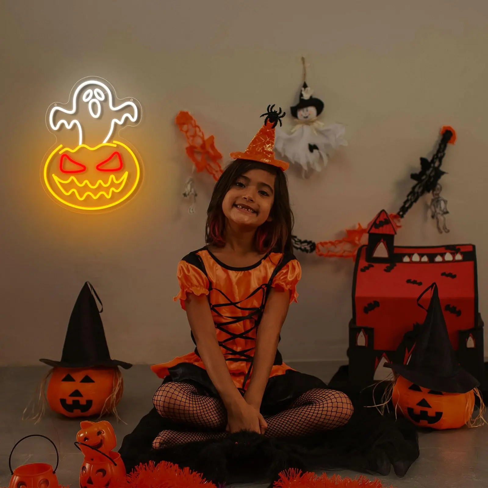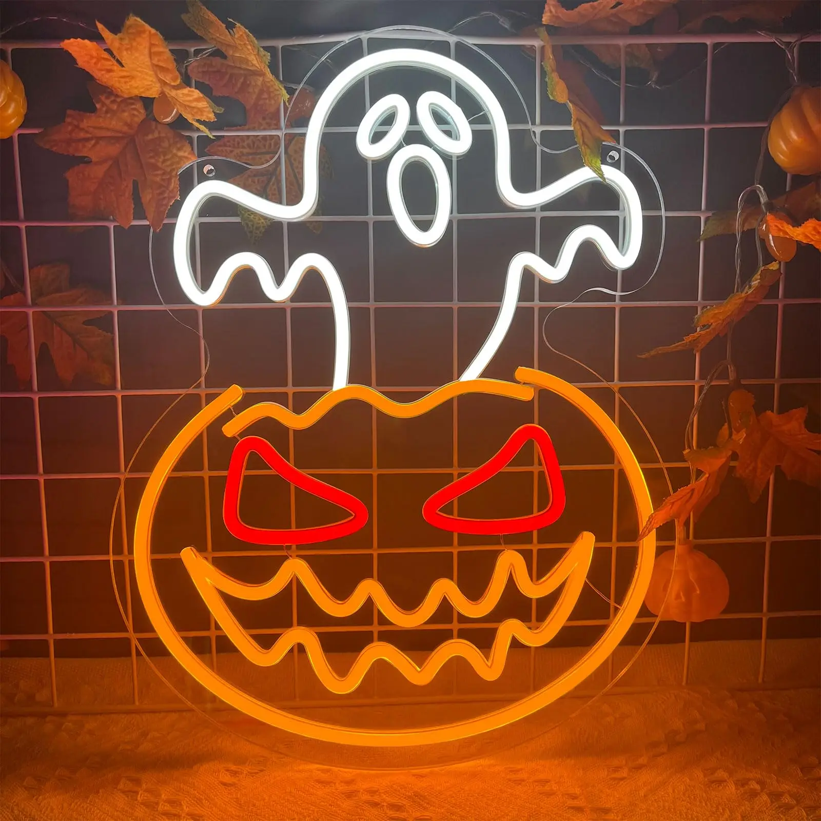 Halloween Ghost Pumpkin Neon Sign, Ghost Face Neon Light Spooky Pumpkin Neon Light Up Signs Dimmable LED Halloween Skull LED Sign for Bedroom Game Room Mancave Bar Halloween Party