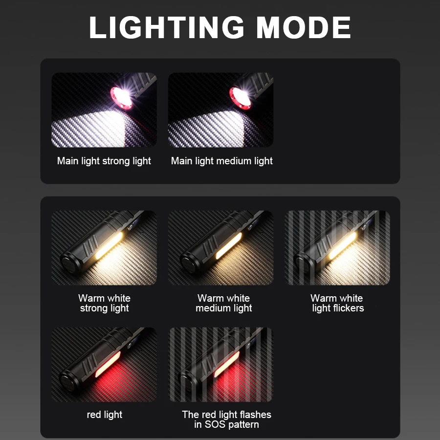 Warm white strong light - Warm white medium brightness - Warm white light flashing - Red light - Red light flashing in SOS mode