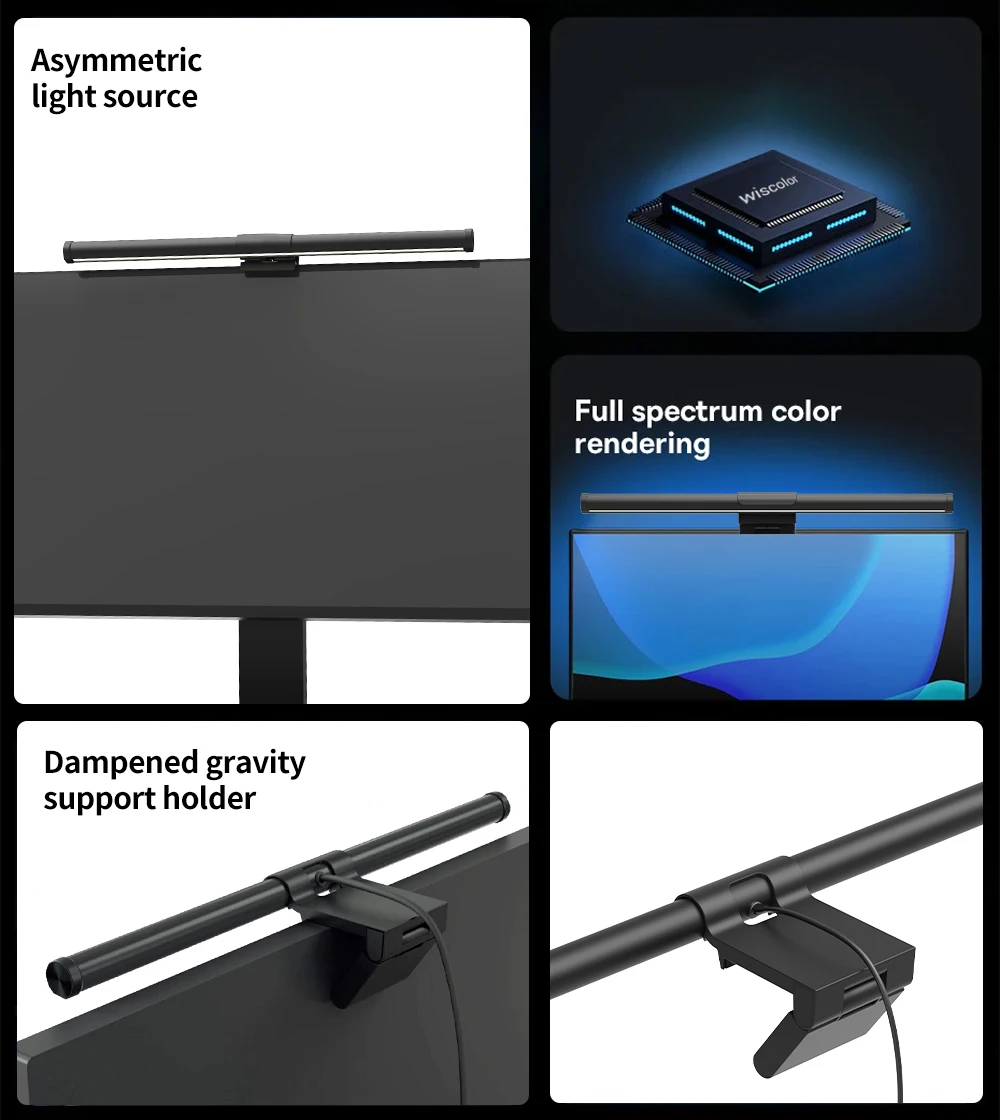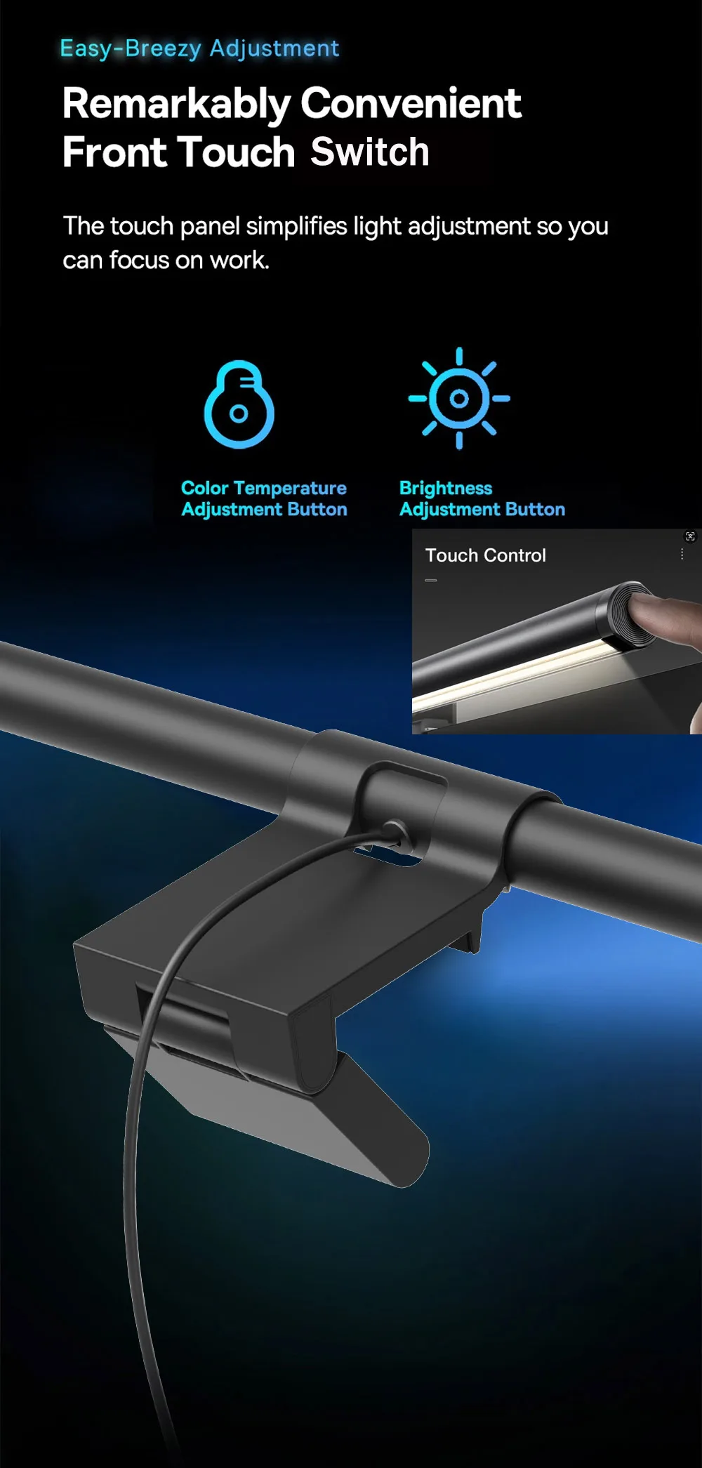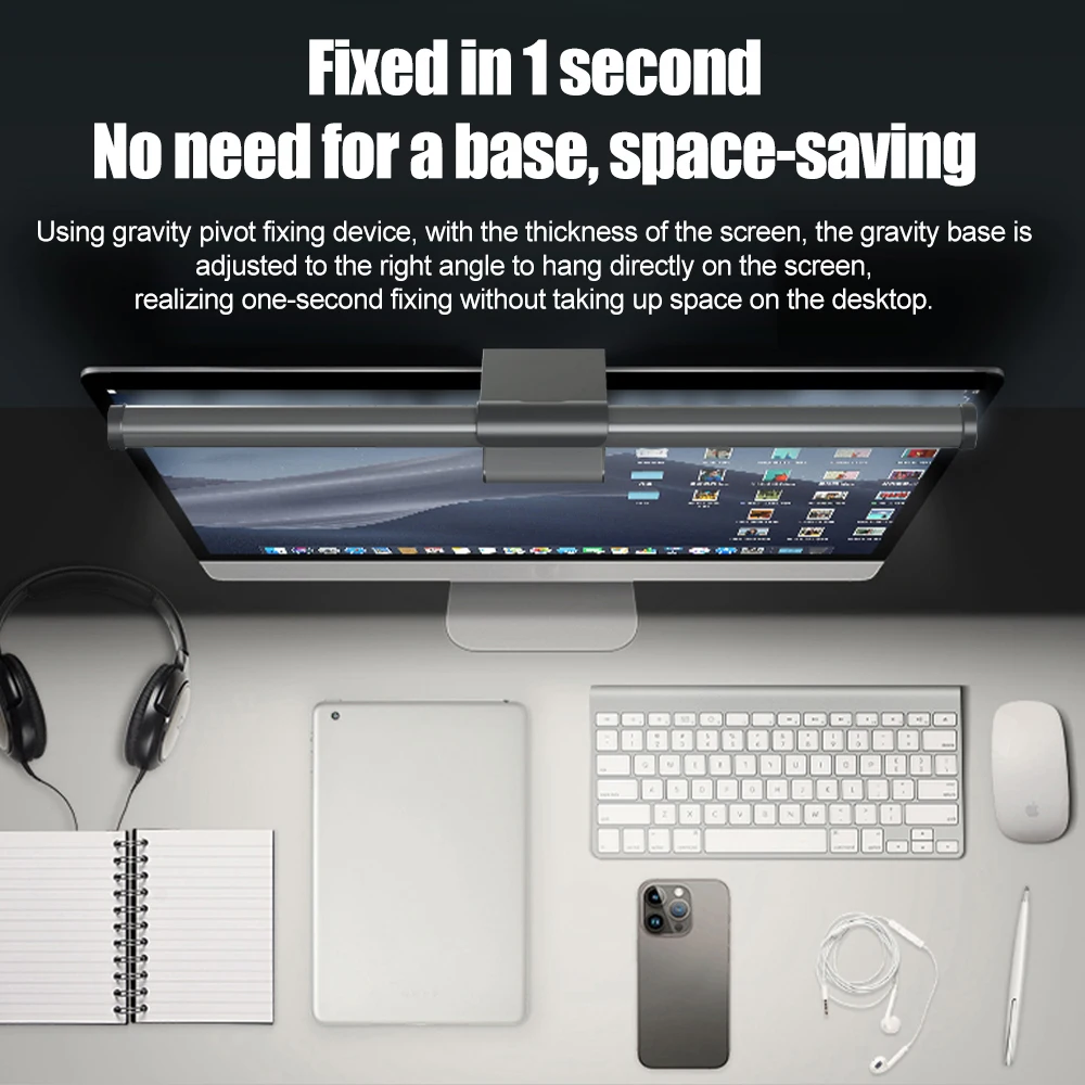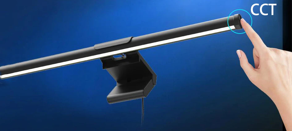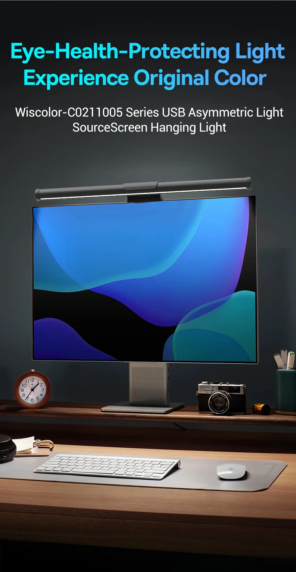 This LED monitor light bar features stepless dimming from 300-1000 lux and color temperature adjustment (3000K-6500K). The asymmetric light design prevents screen glare while providing optimal illumination for work or study.