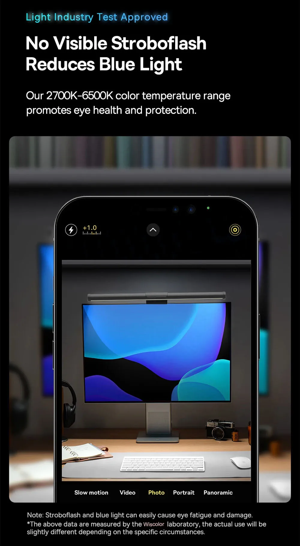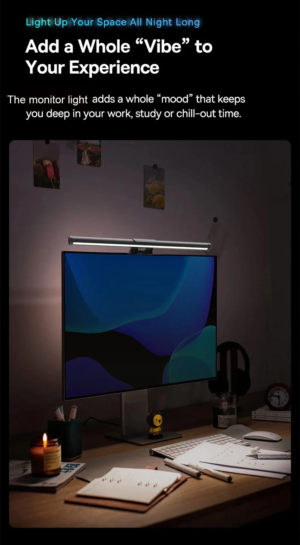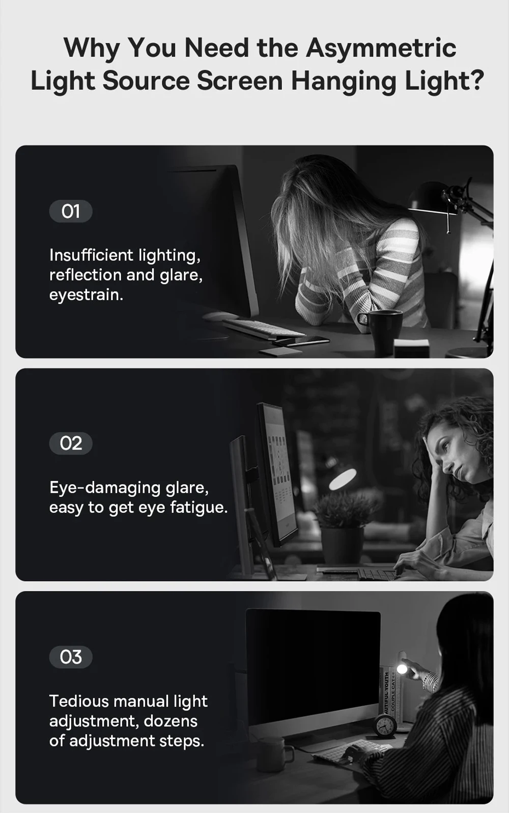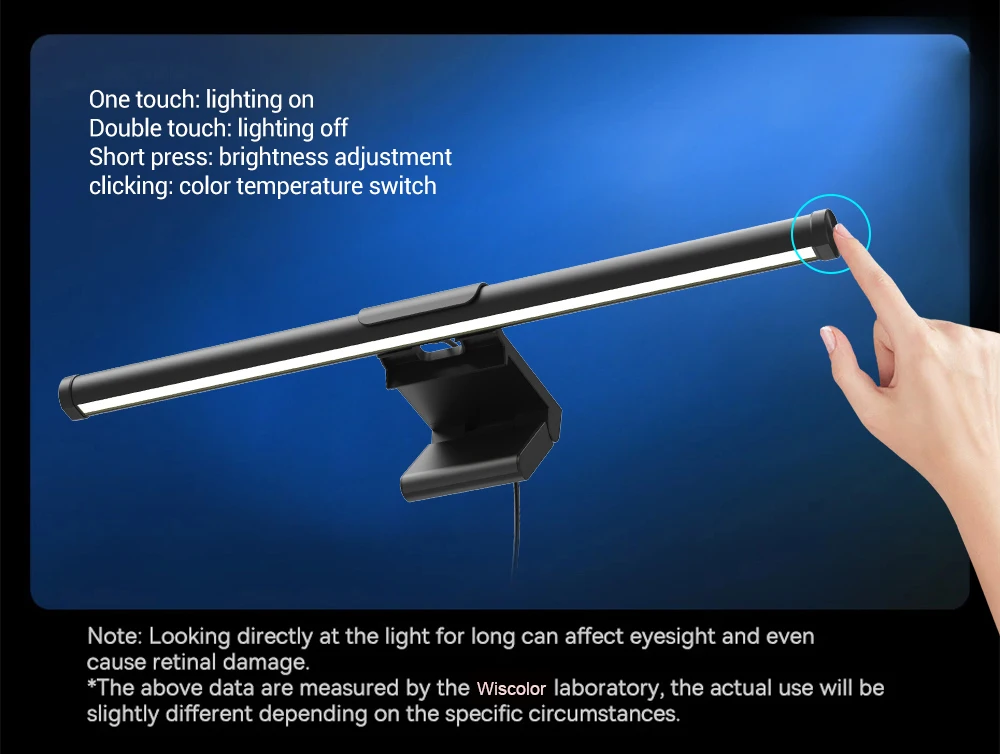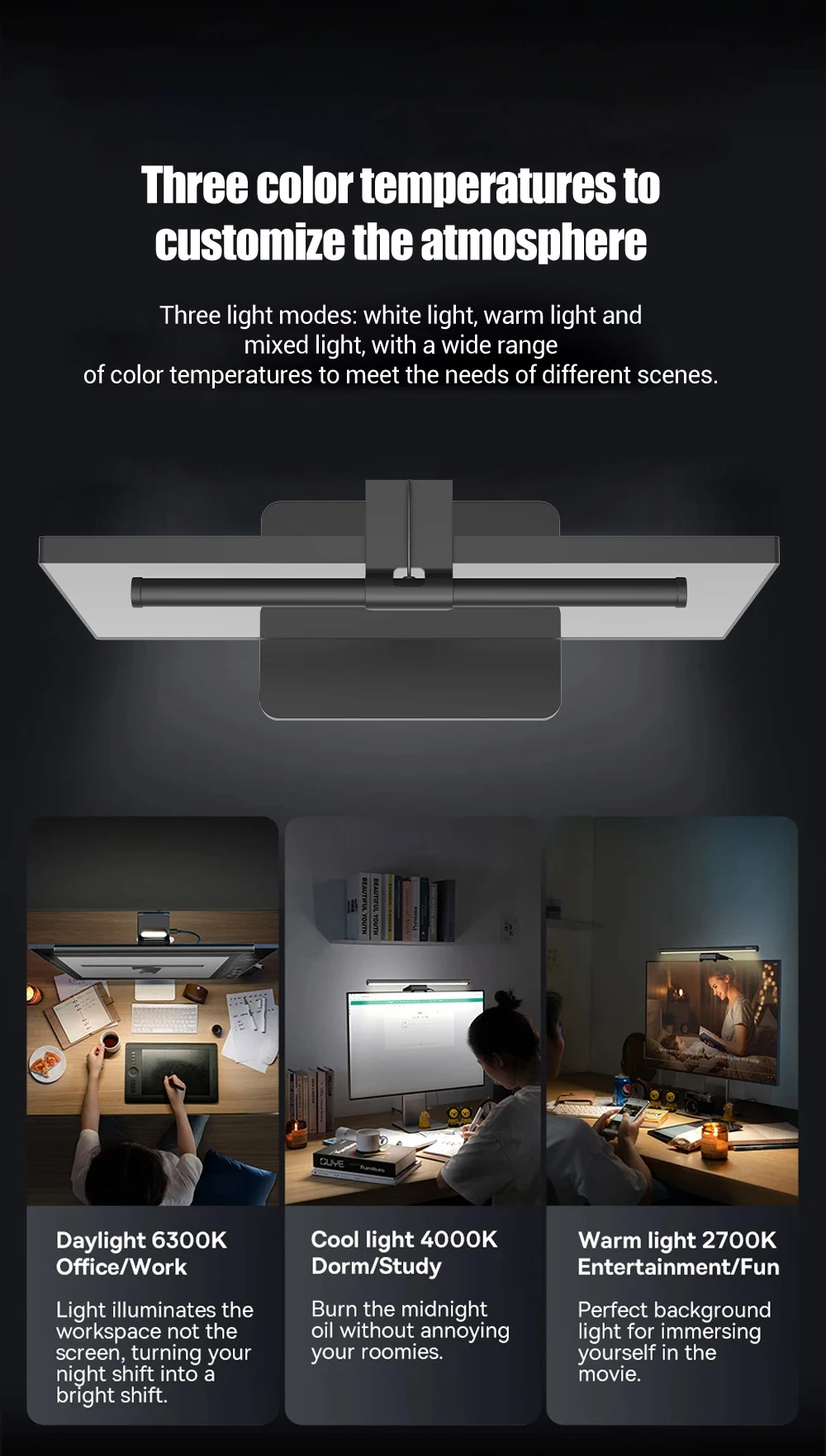This LED monitor light bar features stepless dimming from 300-1000 lux and color temperature adjustment (3000K-6500K). The asymmetric light design prevents screen glare while providing optimal illumination for work or study.
