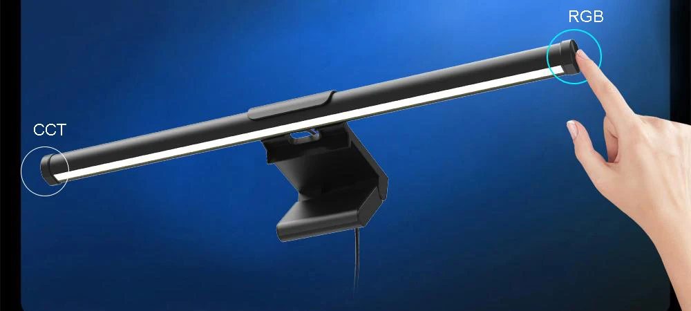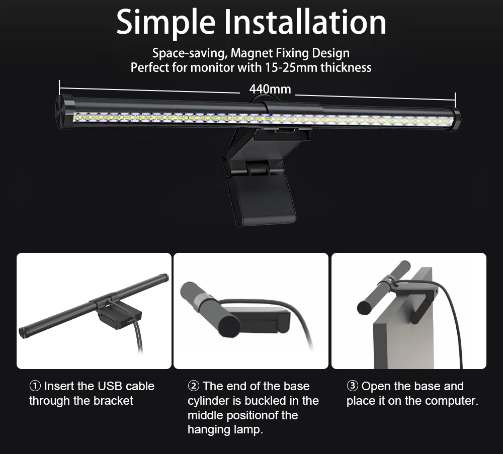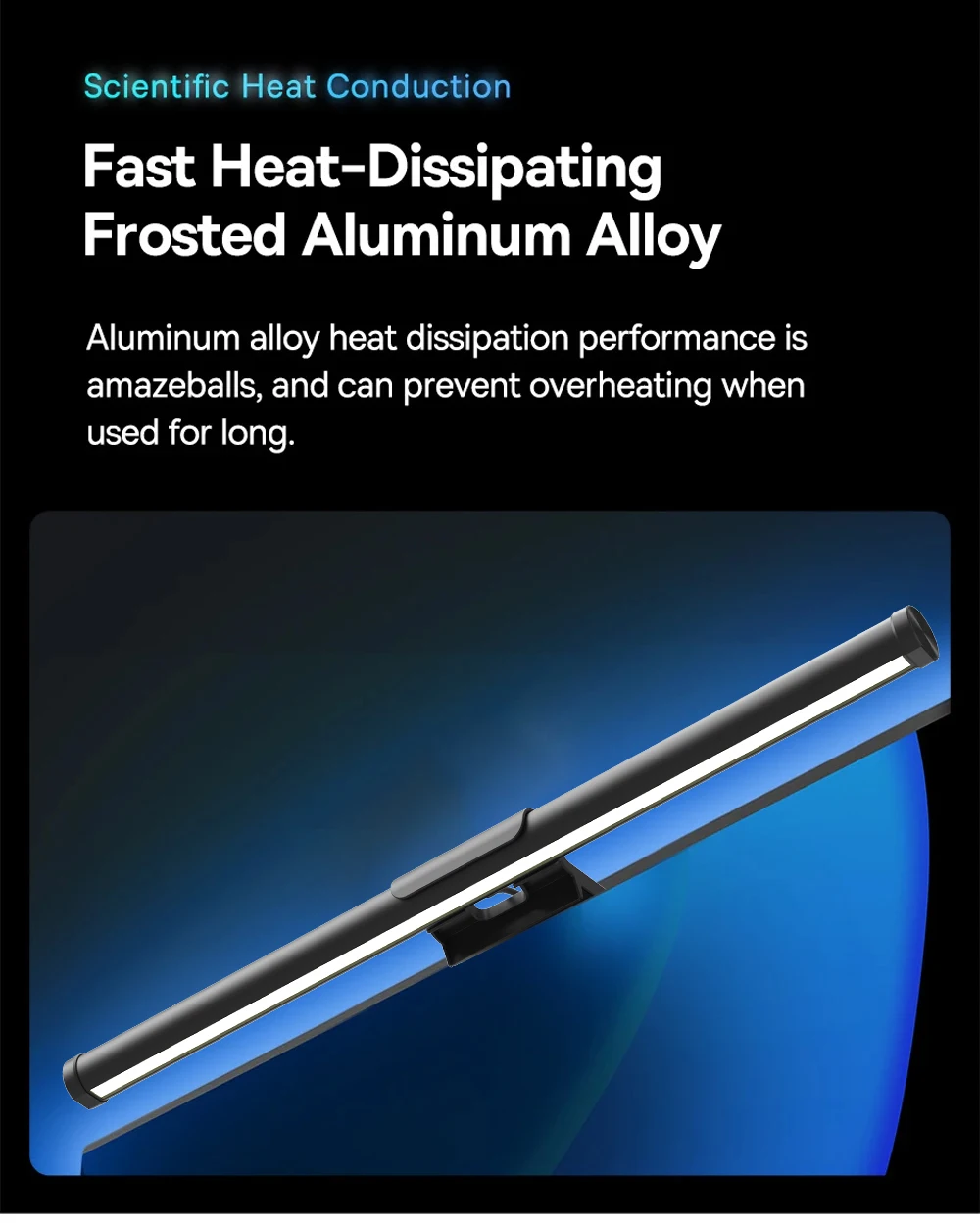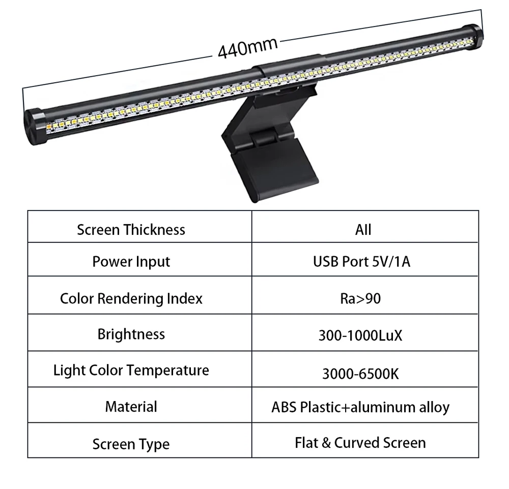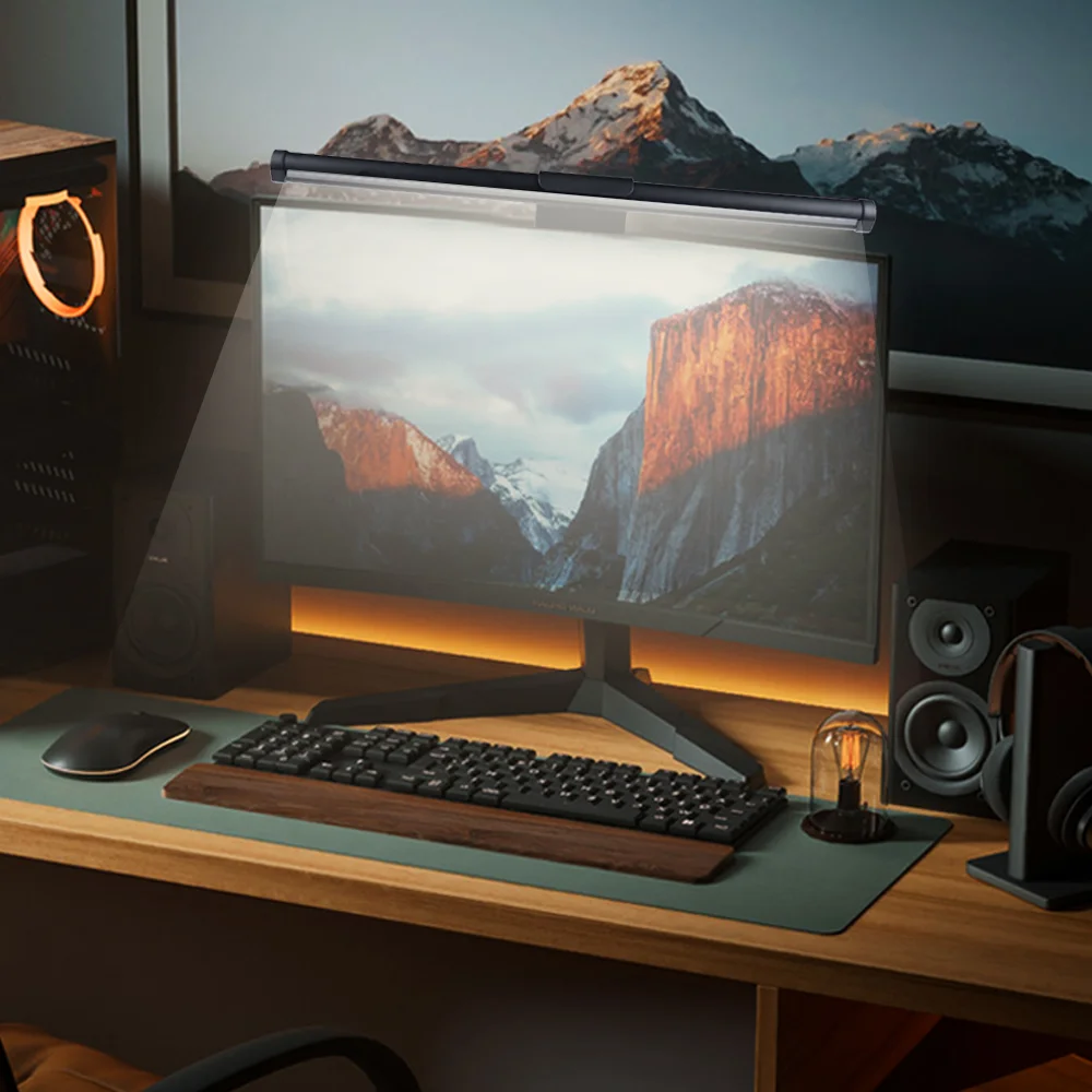 The 44cm aluminum alloy light bar connects via USB for easy power access. Its rotatable joints allow perfect angle adjustment to fit both flat and curved monitors up to 32 inches.