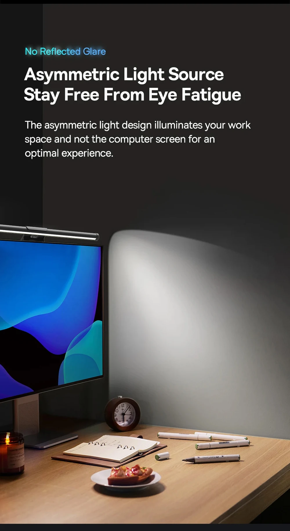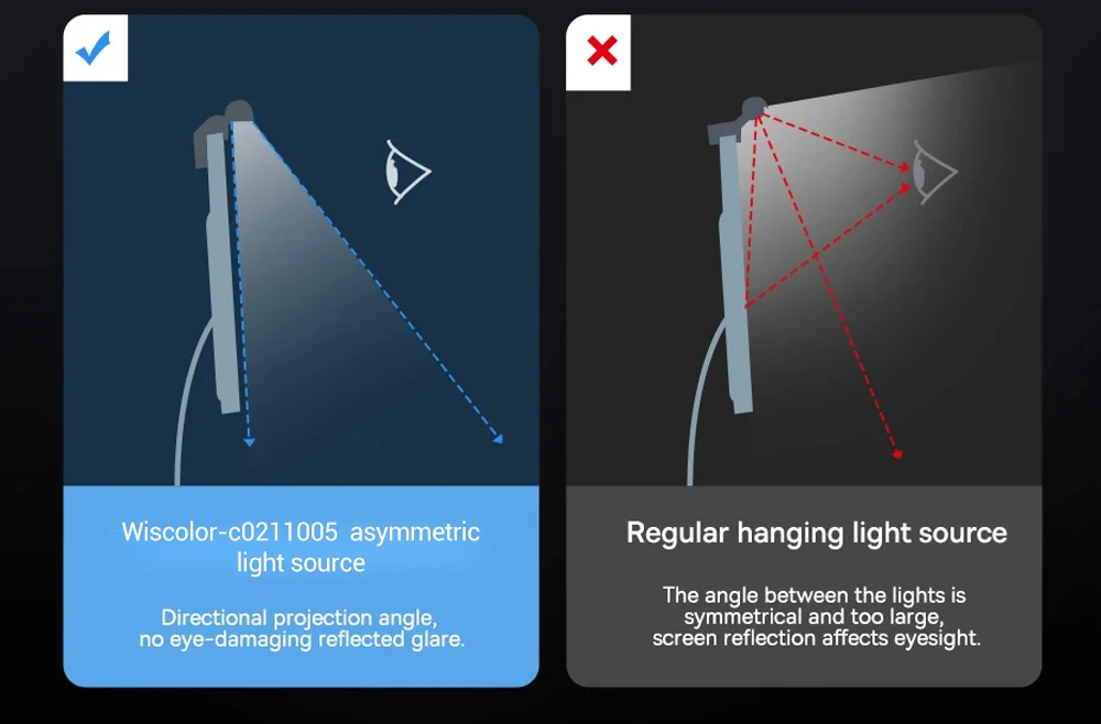 With flicker-free lighting and RA>95 high color rendering index, this screen light reduces eye strain during long computer sessions. The specially designed diffuser eliminates harsh reflections on your monitor.